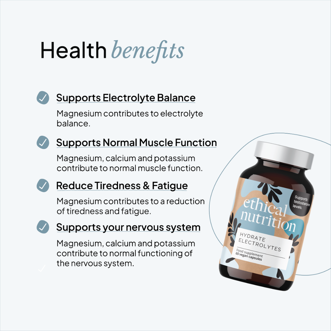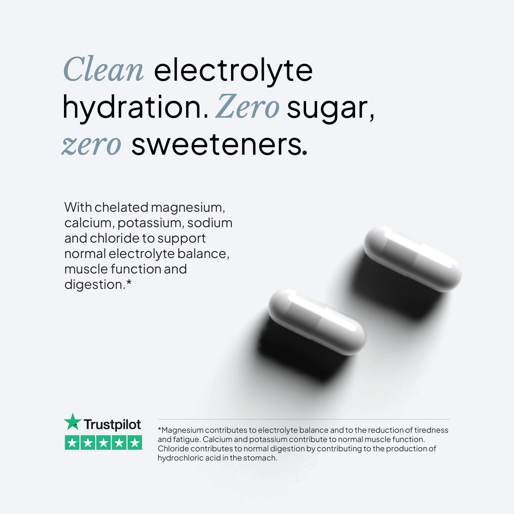 Hydrate Electrolytes provides 100% chelated minerals with a unique blend of amino acids to enhance uptake and absorption. Capsule delivery is clean and convenient (no mixing or measuring required), while our zero sugar, flavouring-free formula is gentle on your digestion and easily absorbed.